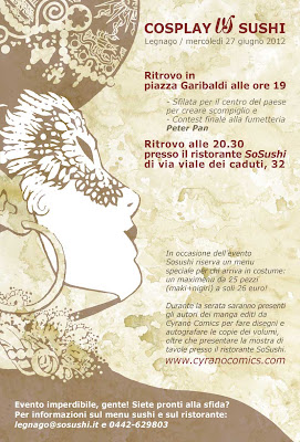 Ebbene si, Cyrano Comics, associazione culturale nata nel 2008 a Verona e che ha come unico amore il fumetto, ha deciso di organizzare questo evento molto particolare. L’appuntamento è per mercoledì 27 giugno 2012 alle ore 19, in piazza Garibaldi a Legnano(VR). È molto selettivo come evento, io, dal mio fresco paesino umbro, di certo non mi sposterò fino alle sperdute terre veronesi per mangiare del sushi, ma dalla regia mi confermano che se siete in zona e se avete fame di buon sushi, l’evento sarà un’ottima occasione per coniugare due passioni che sempre più stanno prendendo piede nel nostro paese, il cosplay e il sushi. Io sono molto più per il sushi, ma delle belle cosplayers non si rifiutano mai.