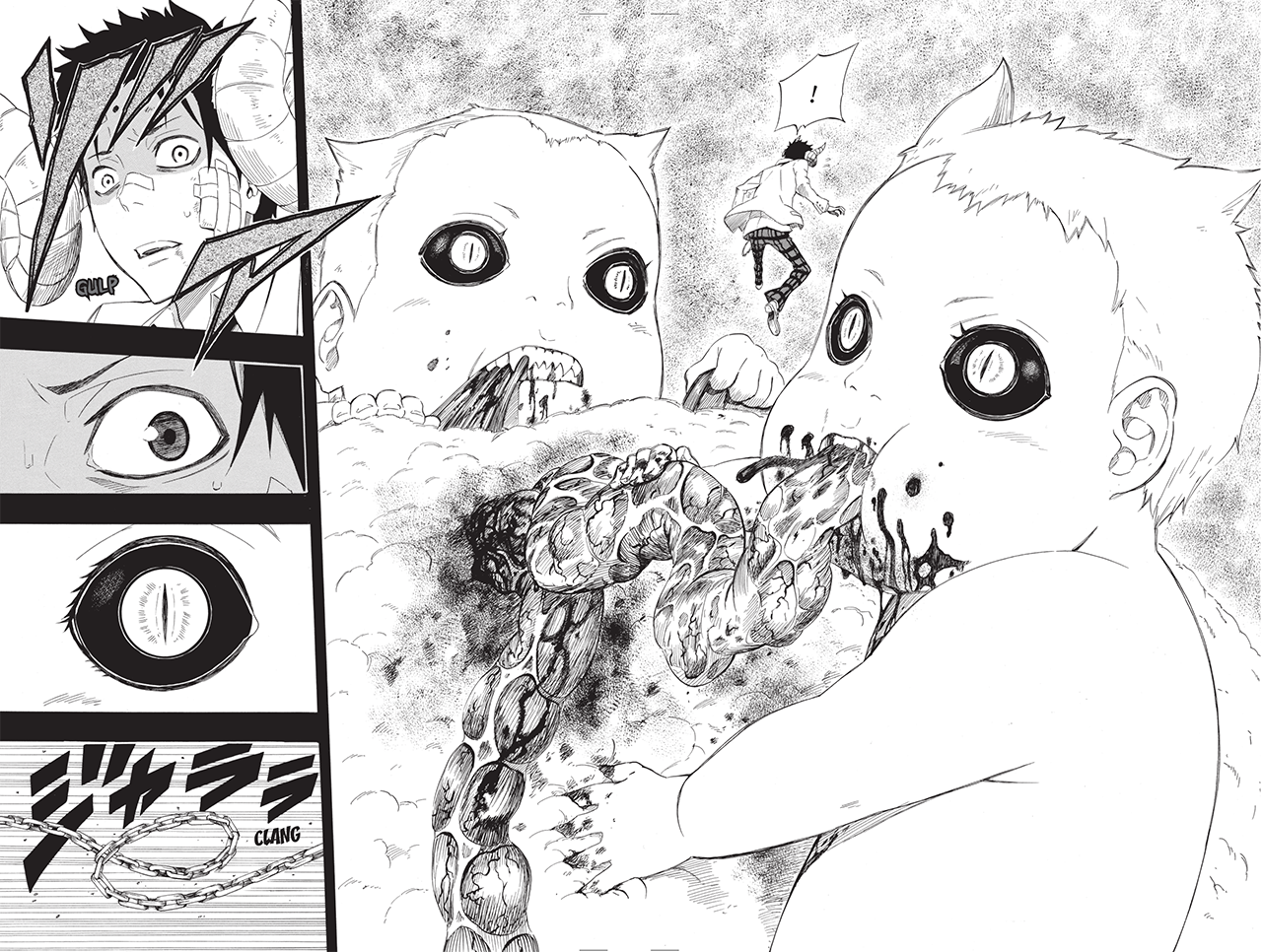 Io in primis non sono uno che adora quando i manga si dilungano inutilmente, nei loro primi capitoli, nell’introduzione di personaggi e status quo, ma qui accade tutto troppo in fretta come se Kishimoto avesse paura che, dilungandosi un po’ di più, non avrebbe avuto abbastanza mordente sul pubblico. Nel primo capitolo: i due ragazzi si incontrano, lei estrae il Lupo di lui, viene introdotta l’amica d’infanzia del protagonista, lui e Ayame si uniscono per battere il primo Lupo, lo mettono temporaneamente KO. A vederli sembrano pochi eventi, ma mettetevi nei panni del protagonista che passa in 24 ore dal non sapere nulla dell’esistenza di Ayame a sostenerla nella sua lotta contro i Lupi. E i capitoli successivamente non migliorano: se da un lato troviamo un rallentare dal punto di vista dell’azione, dall’altro veniamo inondati di informazioni e pezzi di trama generale come se piovesse.