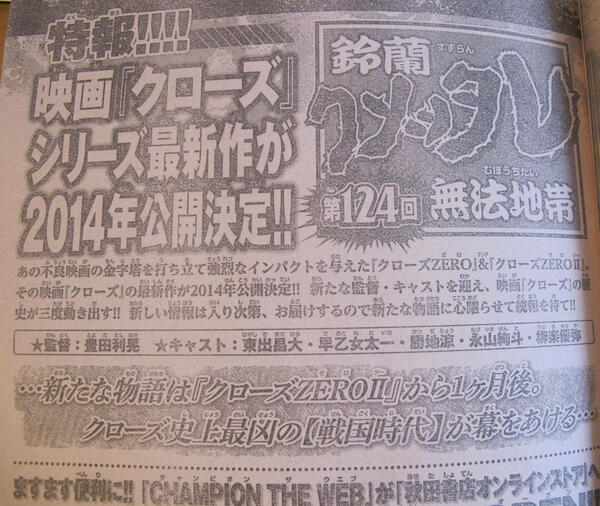 Il canale ufficiale della TOHO ha cominciato a diffondere in streaming quattro spot di Crows Explode già trasmessi in televisione. Crows Explode è il terzo lungometraggio tratto dal manga Crows di Hiroshi Takahashi. Gli spot presentano anche le canzoni Blow Your Mind dei Dragon Ash e whatever you had said was everything dei MAN WITH A MISSION.