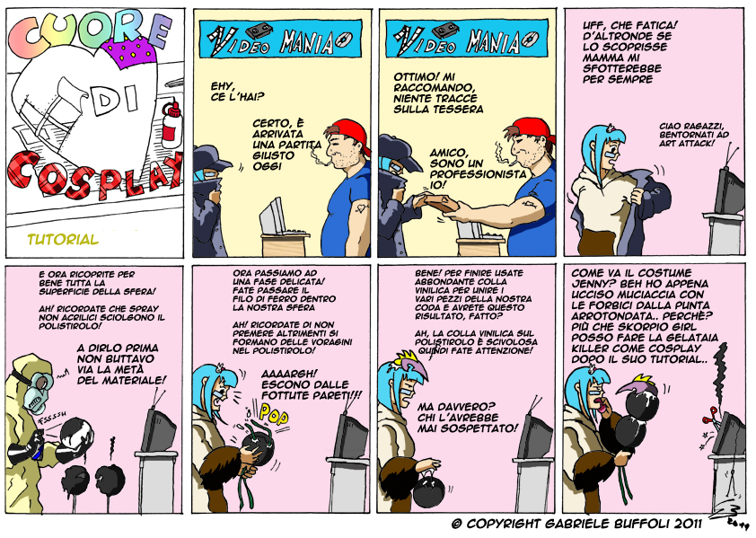 Ogni settimana viene pubblicato sul blog una striscia a fumetti in cui viene trasposto in disegno le varie esperienze di Gabriele vissute conoscendo cosplayer e aver provato su pelle la pratica del cosplay, che consiste – ma suppongo lo sappiate già – nell’indossare un costume che ricordi un certo personaggio oltre che magari saperne interpretare il modo di comportarsi.