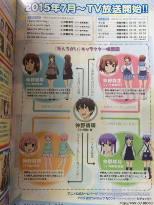 Venerdì di questa settimana, con la pubblicazione del numero di luglio della rivista Manga 4-Koma Palette della Ichijinsha sono state annunciate le canzoni che faranno da tema all’adattamento animato tratto dal manga Danchigai (Grande differenza) di Kazusa Yoneda. Ognuna delle quattro protagoniste femminili avrà la sua theme song nell’anime, interpretata dalla rispettiva doppiatrice. Le canzoni saranno Early Morning di Mutsuki Nakano (interpretata dalla doppiatrice Satomi Akesaka), Let a good day di Yayoi Nakano (interpretata dalla doppiatrice Mikako Komatsu), Gently Mischief di Uzuki Nakano (interpretata dalla doppiatrice Sora Tokui) e Princess Durandal di Satsuki Nakano (interpretata dalla doppiatrice Sayaka Horino).