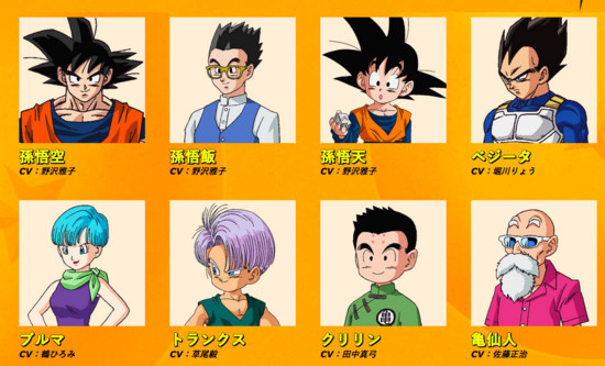 Masako Nozawa doppierà ancora una volta Son Goku, Son Gohan e Son Goten, Ryo Horikawa doppierà Vegeta, Hiromi Tsuru doppierà Bulma, Takeshi Kusao doppierà Trunks, Mayumi Tanaka doppierà Krillin e Masaharu Satou doppierà il Maestro Muten.