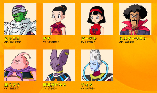 Toshio Furukawa doppierà Piccolo, Naoko Watanabe doppierà Chi-Chi, Yuko Minaguchi doppierà Videl, Unshou Ishizuka doppierà Mr. Satan, Kôzô Shioya doppierà Majin Buu, Kouichi Yamadera doppierà Bills, il Dio della Distruzione, Masakazu Morita doppierà Whis e Jouji Yanami tornerà a rivestire i panni del Narratore.