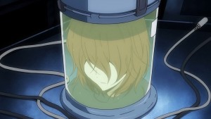 E’ qui che scopriamo, grazie ai racconti di Dotachin ed alle frecciatine di Erika che prendono in giro il tentativo di rottura del 4° muro del ragazzo (grande trovata registica, NdiMu ^^), che i 3 sono uno dei tantissimi gruppi indipendenti che formano la variopinta gang dei “Dollars” di Ikebukuro, dei quali sono entrati a far parte un bel giorno quando Dotachin ricevette l’invito ad entrare tramite un link e la scelta della password (guardacaso, Baccano! NdiMu). Ora pronti a dare la caccia ai rapitori dell’amico, i nostri si lanciano all’inseguimento del furgone rivale ed inizia una combattuta corsa senza esclusione di colpi per le doori di Ikebukuro, in una delle quali perdono il controllo del mezzo e si preparano a combattere se non fosse per Celty che arriva e con la sua sola presenza spaventa i rapitori che mollano Kaztano e si danno alla fuga. Tranne uno di loro, il grassone, che viene fermato e “interrogato” da Erika e Walker con dei metodi non particolarmente ortodossi ma efficaci poiché si scopre che i rapitori agiscono per conto della ditta farmaceutica Yagiri, gestita dalla sorella di Seiji a caccia di teste per i loro esperimenti. Nel corso della puntata abbiamo anche un flash rapidissimo su una testa conservata (presumibilmente) sotto formaldeide e che qualcosa mi suggerisce essere quella di Celty…