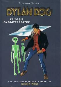 Nel 2004 Panini Comics realizza in edizione speciale per Repubblica un albo appartenente alla Serie Oro dove vengono riproposte tre delle storie più famose di Dylan Dog nelle quali sono coinvolti gli alieni. Il volume era venduto esclusivamente col quotidiano a 7,80€ totali, di formato maggiorato rispetto ai classici albi Bonelli ed interamente a colori. Subito dopo una rubrica d’approfondimento troviamo la prima storia, “Terrore dall’infinito” (prima pubblicazione Dylan Dog 61, ottobre 1991), nel quale un uomo comune una notte a causa di un sogno nel quale gli appaiono degli alieni ricorderà un evento sconvolgente accadutogli trentasette anni prima e che cercherà di sopprimere insieme agli incubi che l’hanno risvegliato affidandosi a Dylan. Queste vicende vengono riprese nell’albo 131 che è anche la seconda storia pubblicata in questo speciale, “Quando cadono le stelle” (agosto 1997), dove ritroviamo Withley Davies, “l’uomo comune” del precedente albo, alla presa con degli alieni in carne e ossa (se di carne e ossa si può parlare) e purtroppo l’esercito inglese incaricato di insabbiare gli avvenimenti, in tutto ciò non mancherà Dylan che verrà casualmente coinvolto nelle operazioni governative. Chiude la serie di eventi e il volume “Lassù qualcuno ci chiama”, storia apparsa per la prima volta nell’albo 136 del gennaio 1998, dove un radiotelescopio capta una voce che pare provenire dai meandri dello spazio ed invita a dirigersi a Llangwntffrwd, un paesino gallese, dove sarà possibile trovare la soluzione all’anomalo messaggio. Senza essere a conoscenza di questi eventi dopo soli 6 mesi il nostro Old Boy si dirigerà in quel luogo dal nome impronunciabile per indagare sulla scomparsa della piccola Eilidh, non vi rivelo altro ma vi invito caldamente a leggere questa trilogia se già non lo avete fatto.