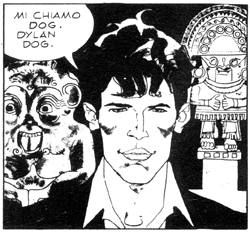 Eh sì, perché dopo le prime battute (e sono proprio battute e sfortunatamente – o fortunatamente – non saranno le uniche che Groucho proferirà in 25 anni di storia editoriale), eccolo arrivare, in tutta la sua bellezza, la sua sfavillante armatura e i suoi poteri da “guardiano del bene”, il nostro eroe: Dylan Dog. E qui che capiamo, definitivamente che questo fumetto vuole, a tutti i costi, rompere con i cliché, con il passato, con storie trite e ritrite di eroi che affrontano il male, lo sconfiggono versando sangue, ma poi trionfano e si “trombano” la bella (questo lo fa anche Dylan, ma ne parleremo in un altra sede!). Dylan Dog, da perfetto inglese, si presenta così: “My name is Dog. Dylan Dog” (l’ho tradotto in inglese per rendere meglio la caratteristica presentazione “all-London”), e non veste nessuna armatura: solo un paio di jeans sgualciti, una camicia rosso sangue e una giacca nera sulle cui maniche sono risvoltati i polsini della camicia. Ai piedi non ci sono stivali d’oro o magici, ma semplici “Clarks” in camoscio chiaro (e non avete idea di quanto abbiano venduto dal 1986 ad oggi in Italia, grazie a questo fumetto!). Il nostro protagonista non ha superpoteri (ma un qualcosa di particolare sì… ed anche di questo parleremo un’altra volta) e non è affatto un eroe: come lui stesso si definirà, più di una volta “Come eroe faccio schifo, ma come anti-eroe sono perfetto!“. Insomma a leggere il primo albo di Dylan Dog pare chiaro, sin da subito che il concetto di “fumetto horror” è solo un pezzo di un puzzle molto più grande che, col passare degli anni, andrà a completare la classificazione di quest’opera.