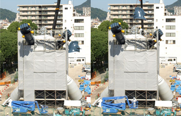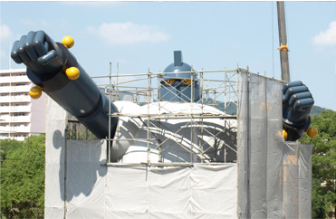 Questo gigante d’acciaio ha delle misure, se posso definirle tali, “poderose”: pesa in tutto 50 tonnellate, e nella posisione piegata su un fianco in cui è costruito è alto 15 metri: la testa da sola pesa una tonnellata, ed è alta 2 metri e mezzo. Nessuna meraviglia che la costruzione abbia richiesto più tempo del previsto, no? Anzi, mi domando se c’entri qualcosa anche quel terremoto di un paio di settimane fa, che ha avuto l’epicentro a qualche chilometro dalla costa del kanto. Mah. Fatto sta che l’inaugurazione era prevista per la primavera del 2008, ma è stata ufficialmente rimandata al 4 ottobre di quest’anno. E poi, a differenza del gundam, questa statua è progettata per essere permanente, e non verrà deassemblata dopo pochi mesi. Quindi anche se non avete in programma di venire in giappone per qualche tempo, state tranquilli che questa statua qui non scappa 😀