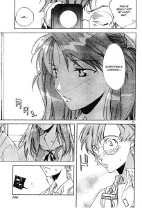 Errori di gioventù: i dodici minivolumi stampati dalla Panini Comics erano stati accuratamente incelofanati, erano solo ventiquattro euro e avevo il disperato bisogno di leggere qualcosa. Soldi buttati certo, ma a lungo termine si sono rivelati essere un investimento imprevisto, questi volumi possono infatti spaventare e tenere sotto controllo un certo tipo di persone, che vi porteranno incosciamente rispetto se passerete le notti leggendogli spezzoni del manga mentre dormono; per non parlare di quando traballa il tavolino… tutte cose vere, io le ho provate davvero. Come fumetto, invece, lo faccio rientrare da anni nella categoria della “carta igienica illustrata“. Ora è lì, che giace nella mia collezione tra i volumi di Psyren e quelli di Short Program, a eterno monito: pensa prima di agire. Le uniche tavole decenti sono quelle delle post-fazioni dell’autore, Fumino Hayashi, in cui ci racconta le peripezie del suo gatto, che odia lui, i suoi retini e il suo lavoro: benedetta bestiola. Il soggetto poi è tratto dalla visual novel di Evangelion, Girlfriend of Steel, (e secondo me alla Panini hanno fatto confusione coi titoli; in Giappone il manga viene anche sottotitolato Angelic Days, a volte) rimaneggiata per motivi di spazio dall’autore. Ma il vero potenziale dinamitardo di questo titolo, a mio avviso, consiste nel minacciare di rivelare all’appassionato medio di Evangelion la vera natura di questo anime, lasciate che vi spieghi perchè.