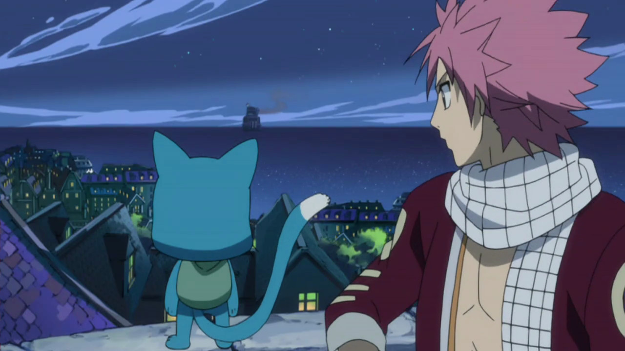 Nello stesso tempo fa il suo arrivo in città un ragazzo sbadato e vivace chiamato Natsu, in compagnia del suo gatto parlante (e svampito), Happy.