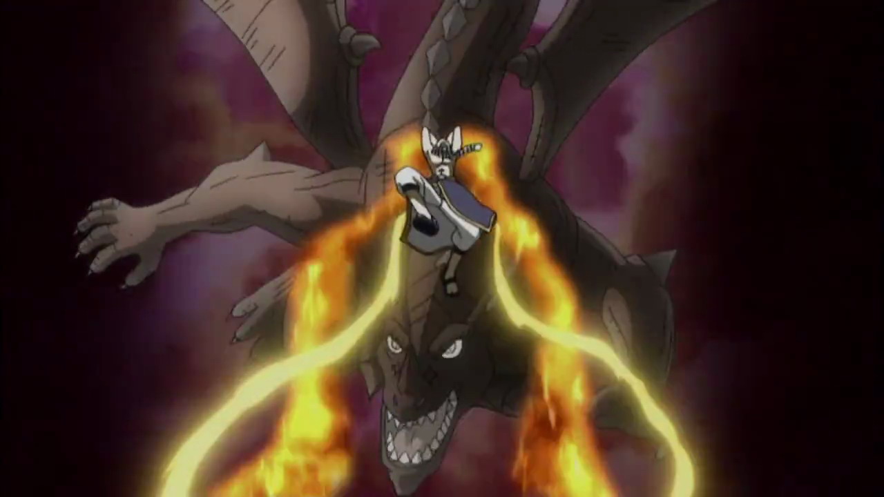 Riassunto: Lo scontro fra le fiamme di Fairy Tail e il vento di Eisenwald prosegue senza sosta. La fortuna sembra voltare le spalle a Natsu, che inconsapevole, in preda alla rabbia incrementa il potere del proprio fuoco fino a livelli inverosimili, riuscendo addirittura a creare una zona di bassa pressione, impedendo così a Eligor le proprie tecniche basate sul controllo del vento. Gli amici di Fairy Tail giungono poco dopo la fine dello scontro ricongiungendosi con il giovane dragon slayer, ma, colti alla sprovvista si lasciano sottrarre Lullaby e il proprio mezzo di trasporto da Kageyama. Ormai il mago di Eisenwald è diretto verso Clover, la sede del raduno regolare, col chiaro intento di far ascoltare a tutti il suono del flauto maledetto.