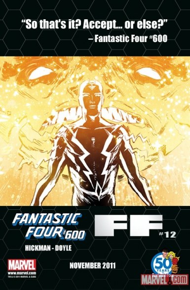 L’atteso numero 600, scritto come abbiamo detto da Jonathan Hickman e con ai disegni un team di artisti composto da Leinil Yu, Steve Epting, Farel Dalrymple , Ming Doyle e gli italianissimi Gabriele Dell’otto e Carmine Di Giandomenico,uscirà a Novembre negli States mentre noi del bel paese dovremo aspettare qualche mesetto in più.