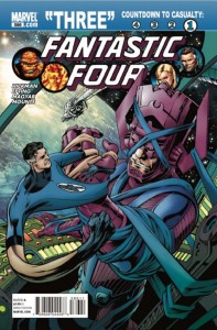 L’ultima saga (chiamata Three) che li vedrà tutti insieme è iniziata a Settembre 2010 in America, fin da subito Marvel ha annunciato che uno dei componenti del quartetto sarebbe perito in seguito alle vicende iniziate nel numero Fantastic Four #583, orchestrato nei minimi particolari dall’autore Jonathan Hickman, militato praticamente da sempre sotto l’etichetta Marvel Comics (con un esordio per la Image Comics) e considerato dopo le sue collaborazione con Brian Michael Bendis nelle serie S.H.I.E.L.D. e Secret Warrior, un “capitano” tra gli autori fumettistici attivi.