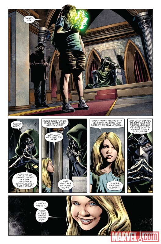 Nel numero che apre la saga Three, l’autore prende in affidamento nelle sue storie un personaggio che nonostante la sua presenza in altri contesti (vedi: altre saghe Marvel) stava latitando sulle pagine dei FF: Victor Von Doom alias Dottor Destino.