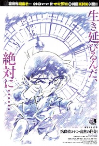 Abbandoniamo ora per un attimo le pagine delle riviste Shueisha per far capolino sul Weekly Shonen Sunday, settimanale pubblicato dalla rivale e allo stesso tempo alleata (vedi Viz Media) Shogakukan. Parliamo delle avventure del piccolo investigatore, Detective Conan, serializzate su questa rivista dal lontano 1994 e che ora annuncia la data di uscita del prossimo film. Il 16 aprile 2011 sarà infatti proiettato Chinmoku no Quarter (Quarter of Silence – Un quarto d’ora di silenzio), il quindicesimo lungometraggio ispirato al manga di Gosho Aoyama la cui realizzazione è stata affidata ad uno staff ormai collaudato e rodato nel tempo dai precedenti progetti. La colonna sonora sarà affidata a Katsuo Ono, il tutto per la regia di