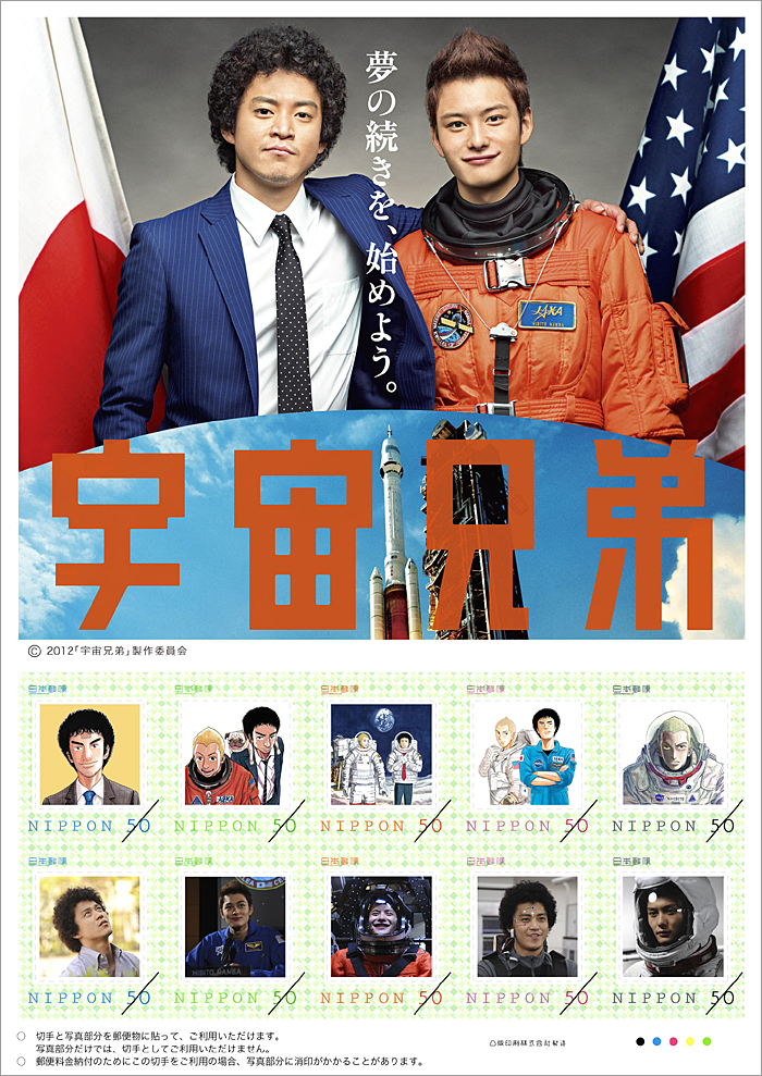 La Yūshu Service Company che si occupa di servizi postali ha annunciato che dall’1 Maggio comincerà a stampare una serie di francobolli ispirati al manga di Uchu kyodai – Fratelli nello spazio e all’omonimo lungometraggio live-action ispirato al manga. I francobolli serviranno anche a festeggiare la prima del lungometraggio che sarà in Giappone il 5 Maggio.