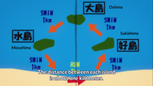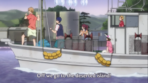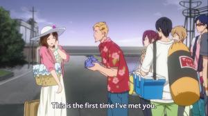 Perchè il tema di quest’episodio è proprio quello: il mare. Un pò perchè è estate, un pò perchè è divertente, il club di nuoto dell’Istituto Iwatobi decide di andare in campeggio, allo scopo di allenare la resistenza necessaria per le future competizioni: il classico dei classici, signori. Il campo estivo, poi, qualcosa che non può mancare in un anime a tema sportivo, figuriamoci in un prodotto della KyoAni poi, in cui quest’evento diventa sempre la causa di tanti sviluppi, nonchè di momenti indimenticabili. Purtroppo però il club di nuoto è privo di fondi: dopo essersi pagati da soli le divise, poi, non hanno più così tanti soldi da poter spendere per un viaggio e la scuola non fornirà un altro yen dopo aver coperto le spese per rimettere in sesto la piscina. Purtroppo, l’idea di lavorare part-time, risultata funzionale quando fu necessario acquistare una chitarra, non può venire incontro ai protagonisti per una crudele carenza di tempo. Ciononostante il presidente del club, Makoto, riesce a trovare una soluzione, e dopo aver messo su l’attrezzatura da campeggio e convinto il loro vecchio allenatore (in possesso di… un peschereccio..) ad accompagnarli su un’isola deserta che deserta non è, Makato, Haruka, Hazuki e Rei si possono finalmente dedicare al complesso e infernale programma di allenamenti tramandato dal precedente club di nuoto della loro scuola, che non ha mai goduto di un momento di gloria. Su quest’isola poi, punto di partenza di un infernale circuito di allenamento che collega fra di loro quattro piccole isole, i delfini dell’Iwatobi incontreranno gli squali della Samezuka che si vanno ad allenare nella loro sede estiva provvista di piscina al coperto (e qui mi chiedo… che ci andate a fare al mare?)