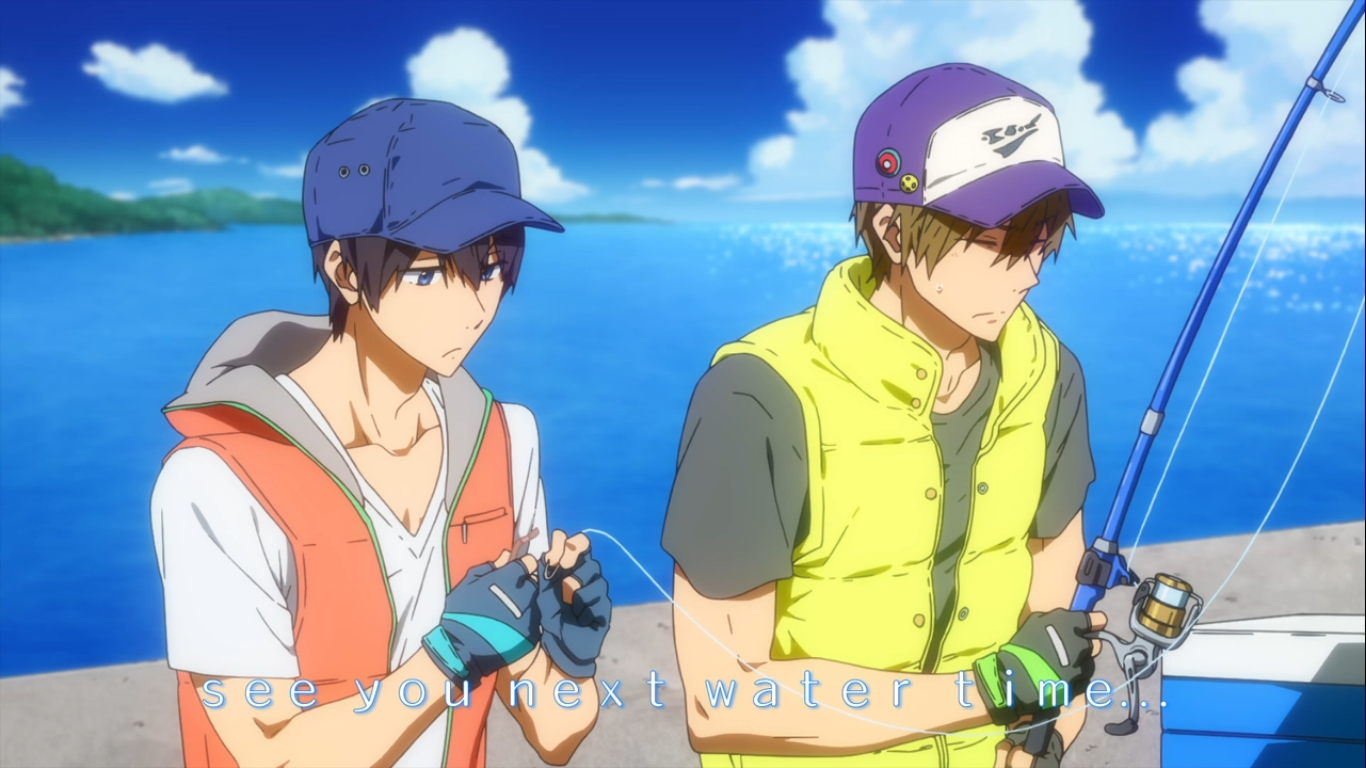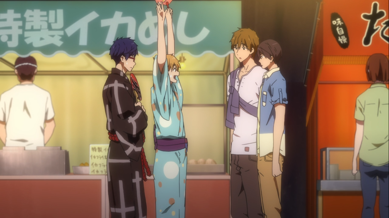 Oramai Hazuki e Rei sono gli unici due personaggi “attivi” di questa serie, sono riusciti ad animare a sufficienza la situazione: infatti, in pieno festival notano Rin con il suo amico di cui non ho voglia di controllare il nome... e quindi, per evitare che il morale di Haruka affondi ancora di più, i due decidono di adoperarsi per evitare che squalo e delfino si incontrino. E per fare questo Rei viene mandato a pedinare Rin; assiste anche alla scena in cui questi si piange addosso, davanti alla piscina della scuola elementare dove andava con gli attuali assi dell’Iwatobi. Per il resto ci vengono fatti vedere tutti gli eventi più popolari del festival di questo ridente villaggio di pescatori: dalla pesca del calamaro a mani nude, molto caratteristico, alla cattura dei pesci rossi, molto più classico; l’occasione è talmente speciale che ci viene concesso di vedere Kou in yukata (motivo per cui fondamentalmente ho deciso di non lamentarmi troppo della lentezza negli sviluppi della trama principale)… manca la professoressa in costume da bagno e anche noi maschi possiamo ritenerci soddisfatti. A tre episodi dalla fine poi, possiamo ufficialmente affermare che tutte le pedine sulla scacchiera sono state disposte per lo scontro finale: a quanto pare il club di nuoto dell’Iwatobi affronterà di nuovo Rin alle regionali, e stavolta nella staffetta!