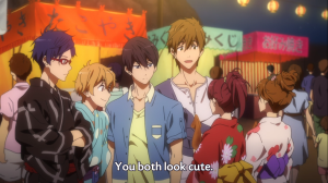 Il resto dell’episodio è Rei-centrico. Siccome è estate e hanno voluto far contenti un pò tutti hanno tirato fuori il classico episodio del festival in cui vengono sfoderati gli yukata in modo da farsi fare i complimenti… Free! non è da meno, come i tanti anime a tema scolastico rispetta questo importante appuntamento, ma dei quattro del club di nuoto solo in due hanno indossato l’abito buono: cosa che di media fanno i bimbi, gli anziani, e le studentesse… ehi, non ho detto niente!! (Scusate, il suggeritore…)