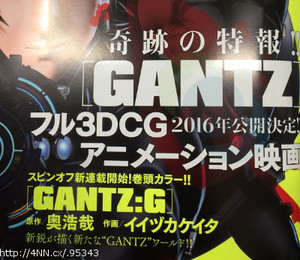 Con la pubblicazione del numero di Dicembre della rivista Miracle Jump edita dalla Shueisha, è stato dato l’annuncio, il 17 Novembre di quest’anno, che dal manga di Gantz di Hiroya Oku sarà tratto un lungometraggio d’animazione completamente in 3DCG (Computer grafica in tre dimensioni) che uscirà nel 2016. Il numero precedente di Miracle Jump, quello di Novembre, aveva svelato, il mese scorso che Hiroya Oku e Keita Iizuka (Blue Gralia) avrebbero lanciato uno spinoff di Gantz, il cui titolo temporaneo era stato annunciato come G-GANTZ, ma è stato successivamente confermato essere GANTZ:G, proprio a partire dal numero di Dicembre della rivista, in vendita il 17 Novembre.