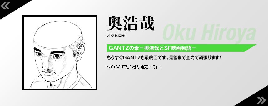 Sul quattordicesimo numero di quest’anno della rivista Miracle Jump edita dalla Shueisha è stato dato l’annuncio che l’autore di Gantz, Hiroya Oku, porterà a conclusione molto presto la pubblicazione del suo manga. Oku ha scritto un commento nella sezione del sito ufficiale della rivista dedicata alle note dell’autore, nella sua colonna illustrata intitolata Origin of Gantz – A Story of Hiroya Oku & Sci-Fi Movies. Nel commento, Oku dice che Gantz presto raggiungerà il suo capitolo conclusivo e che lui, in quanto autore, farà del suo meglio fino alla fine.