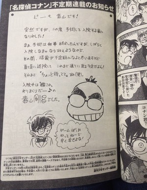 Con la pubblicazione del sedicesimo numero di quest’anno della rivista Weekly Shonen Sunday edita dalla Shogakukan, il mangaka Gosho Aoyama, autore di Detective Conan, ha annunciato che la pubblicazione del suo manga più famoso proseguirà a ritmo irregolare. L’annuncio, arrivato alquanto improvvisamente, è stato causato, così ha spiegato Aoyama, dalle sue condizioni di salute che l’hanno costretto a recarsi in ospedale per un’operazione chirurgica. L’autore ha voluto rassicurare i suoi fan, dicendo che l’operazione si è svolta come pianificato e senza incidenti, ma che purtroppo si trova costretto a restare in ospedale per più tempo del previsto.