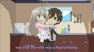 La Xebec, se volete il mio personale giudizio, questa volta ha fatto un ottimo lavoro. Era difficile, vista la struttura della prima serie, incentrata più sull’uso in chiave umoristica di elementi della letteratura horror americana del secolo scorso, mescolati con riferimenti presi dai più classici eroge, o hentai per come siamo abituati a sentirli chiamare in Europa, con un tocco velatamente parodistico. La prima serie giocava su situazioni tempisticamente ben orchestrate di avvicinamento/allontanamento (spesso per disgusto) da parte del protagonista Mahiro nei confronti di Nyarko, una Nyarlathotepiana incaricata di proteggere il pianeta Terra dalla pirateria spaziale che mira ad impossessarsi di manga, anime e videogiochi prodotti dal genere umano. Ma Nyarko si innamora follemente di Mahiro, il quale, come dicevo, deve sempre calmare le bollenti intenzioni della folle aliena di cui non vuole conoscere le altre 999 manifestazioni. La prima serie aveva anche altri due personaggi al centro della vicenda, Kuuko, un’aliena follemente innamorata di Nyarko e appassionata di giochi di ruolo, e Hasuta, un ragazzino (doppiato da Rie Kugimiya, che dovreste conoscere) che vorrebbe timidamente far suo Mahiro. Velati riferimenti sessuali, e situazioni archetipiche al limite tra la commedia e l’horror dominavano la prima serie, a cui diedi un timido cinque e mezzo in virtù del fatto che i personaggi e gli intrecci sono da sempre azzeccati. Peccava la ridondanza delle gag umoristiche, e l’inserimento dell’odiato e fastidioso Hasuta.