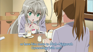 E poi quello che episodio dopo episodio mi fa ridere davanti allo schermo come un cretino: le citazioni, le decine di citazioni che si riescono a cogliere in ogni episodio, alcune anche sfacciatamente sbattute nella scena senza preoccuparsi di una cosa chiamata copyright. Niente si salva, Dragon Ball, Kenshiro e i shonen più famosi, ma anche prodotti più recenti come Oreshura, Hyouka e To Love-ru Darkness vengono crudelmente mostrati, citati, trasformati per essere la linfa vitale di questa serie, che come le creature dell’orrore lovecraftiano devo consumare per sopravvivere. E il risultato, per me, che nove volte su dieci la citazione mi appare chiara come la luce del giorno, è un anime che riesce a darmi tante piccole soddisfazioni. Che poi la storia va anche avanti, e i personaggi “crescono” in qualche modo, soprattutto inaspettato in questo anime che, come parodia di tutto quello che è il mondo degli otaku, ha finito per parodiare anche se stesso. Ho iniziato a guardare la seconda serie senza troppe pretese, ed è diventato uno degli appuntamenti più attesi della settimana, e se continuano così, mi faranno sperare per una terza.