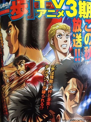 Sul trentaquattresimo numero di quest’anno della rivista Weekly Shonen Manga della casa editrice Kodansha è stata data la notizia che dal manga Hajime no Ippo, letteralmente Il primo passo, ma noto anche col titolo internazionale di Fighting Spirit, di George Morikawa sarà tratta una terza serie televisiva d’animazione. Il primo episodio della terza serie di Hajime no Ippo andrà in onda in Giappone nel corso dell’autunno di quest’anno. Nell’immagine che è stata pubblicata su Weekly Shonen Manga per dare l’annuncio è possibile leggere un testo che recita “Ippo combatte contro un formidabile avversario, Sawamura! Dempsey viene sopraffatto?!”