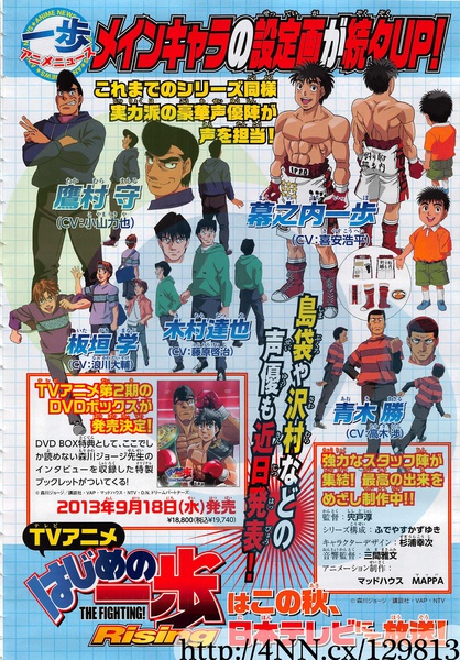 Il trentanovesimo numero della rivista Weekly Shōnen Magazine edita dalla Kodansha mercoledì di questa settimana ha annunciato il cast e lo staff della nuova serie d’animazione televisiva di Hajime no Ippo intitolata Hajime no Ippo Rising. I doppiatori che prenderanno parte alla serie sono Rikiya Koyama col ruolo di Mamoru Takamura, Daisuke Namikawa col ruolo di Manabu Itagaki, Keiji Fujiwara col ruolo di Tatsuya Kimura, Kohei Kiyasu col ruolo di Ippo Makunouchi e Wataru Takagi col ruolo di Masaru Aoki.