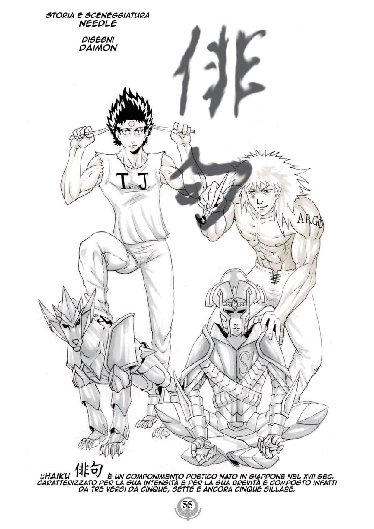 Di genere lievemente diverso le altre tre storie “serie” di questa raccolta. Nella prima, di cui non sono riuscito a comprendere il titolo, Needle e Daimon, gli autori, ci presentano due cavalieri di bronzo (uno è quello del lupo, l’altro non ho ben capito se sia inventato ex-novo o una libera rielaborazione di quacuno esistente) impegnati in una missione di salvataggio nel marzo del 2011 in Giappone (vi dice niente questa data?) nella prefettura di Iwate: messi alle strette da un mostro selvaggio, i due verranno aiutati da una vecchia conoscenza della serie classica, ora nuovo Santo della costellazione dell’Ariete (e quando capirete chi sia, vi verranno due lacrime agli occhi per la bellissima citazione!).