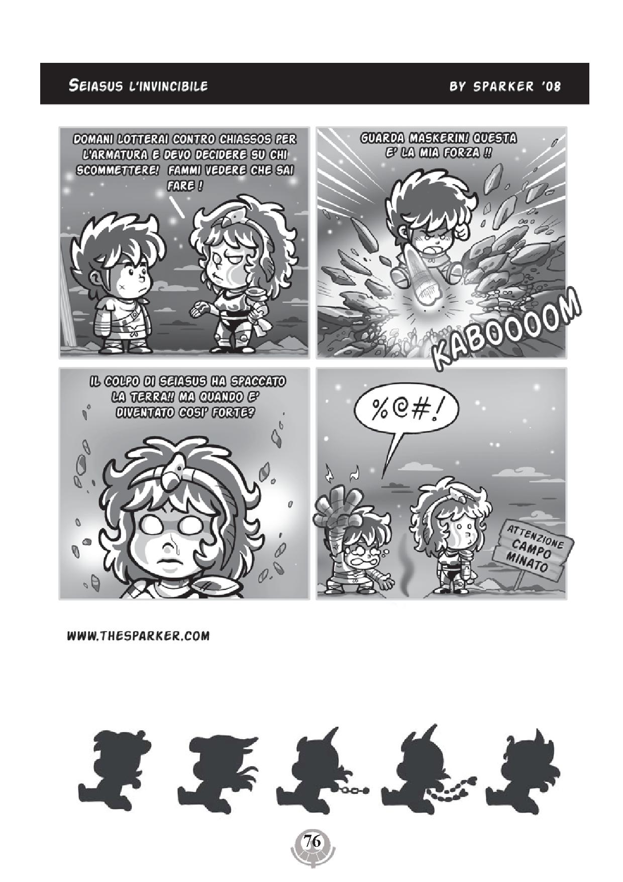 Nelle storie da una pagina di Sparker, incentrate sulla figura di “Seiasus” versione super-deformed e bambocciona dell’amato/odiato protagonista della serie classica, assistiamo alla narrazione alternativa e parodistica delle vicende del cavaliere della Costellazione del Cavallo Alato, dagli allenamenti per l’investitura a Cavaliere, fino alle prime fasi della Guerra galattica (e di cui, a lato, potete ammirare la prima storia dal titolo “Seiasus l’Invincibile“).