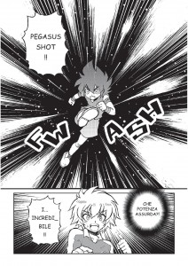 La terza storia, infine, dai toni più leggeri (ed anche qui, non ho compreso il titolo) trasporta gli eroi classici in un mondo alternativo dove Seiya e Co. sono membri di una associazione calcistica studentesca e disputano una partita (nel più perfetto stile “Holly & Benji”) a suon di… tiri segreti basati sulla forza del Cosmo! Citando liberamente proprio i primissimi episodi del manga “Capitan Tsubasa”, l’autore ci presenta una squadra, formata dai giovani Cavalieri di bronzo della Guerra Galattica, pronti ad ammettere tra le loro fila un appena arrivato “Seiya” per fronteggiare la squadra rivale capitanata da “Ikki”!