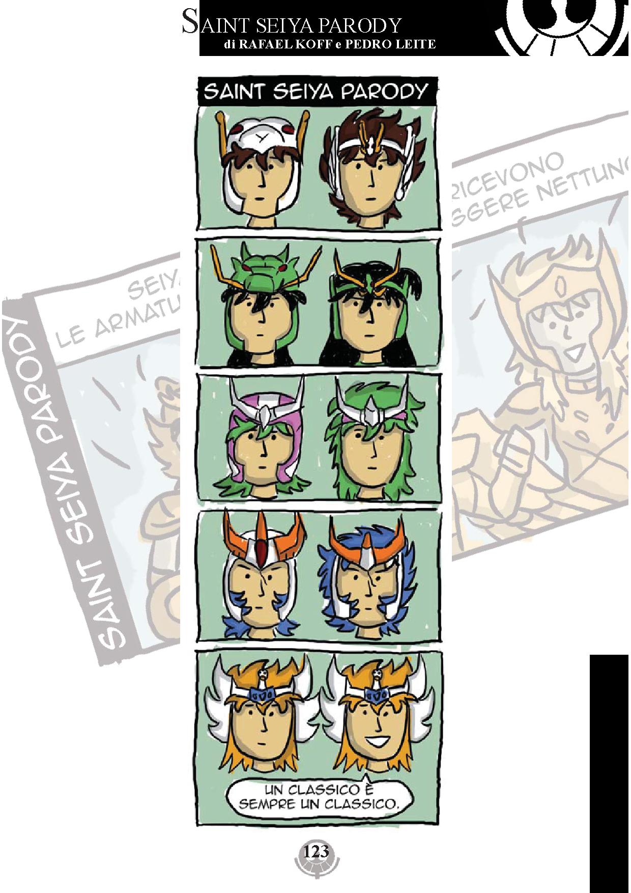 Le strisce del duo, invece, concentrano la loro attenzione su faccende più “delicate” e introspettive: potremmo intitolarle come “Tutto quello che Kurumada avrebbe voluto rivelarci sui Santi, ma non ha avuto il coraggio di fare!”, e analizzano in modo dissacrante e ricco di umorismo alcuni fatti salienti della storia classica, rivelandoci retroscena e verità che avremmo solo potuto immaginare. Di fianco, una delle tipiche strisce del duo, che mette in evidenza come il passaggio da una saga all’altra (o dal manga all’anime, volendo) non è detto che colpisca tutti i personaggi!