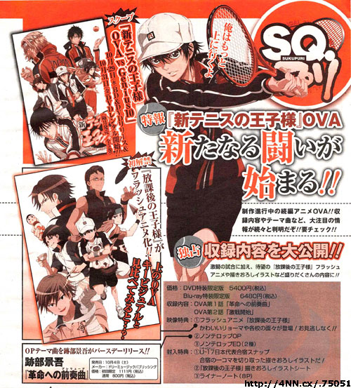 Jump Square ha anche annunciato che il nuovo CD di Keigo Atobe della sigla di apertura di Shin Tennis no Ōji-sama intitolata Kakumei e no Prelude uscirà il 4 Ottobre, il giorno del compleanno di Atobe.