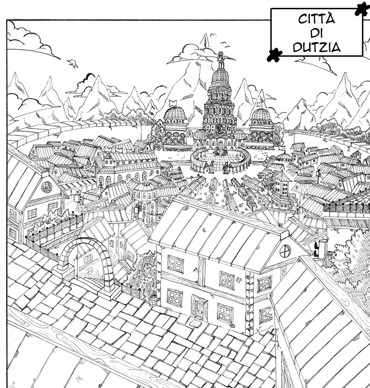 Il sole è già alto in cielo a Dutzia (Deutzia… purtroppo non si capisce bene se la città sia Dutzia e il regno Deutzia, oppure è solo una svista di “lettering”) e la vita scorre frenetica… soprattutto per qualcuno che, appena sveglio, dovrà precipitarsi nella piazza principale per assolvere al proprio lavoro, dal cui esito dipenderà la propria carriera.