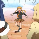 Inevitabilmente, tutte e quattro le ragazze, finiscono con il perdersi fin quando scovano una porta chiusa e, cercando di aprirla, rompono la maniglia. Cosa fare a questo punto? Mah… rompere il vetro? 😀 Un’accozzaglia di casualità rompe il vetro e fa giungere sul posto un professore che… viene atterrato 😀