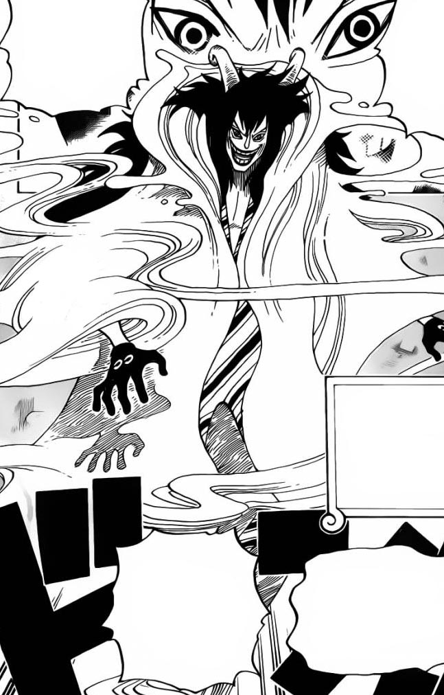 Tornando a Vergo; questo personaggio ci è stato presentato di sorpresa e col botto ed, inevitabilmente, un sacco di misteri lo hanno fin dall’inizio accompagnato,la maggior parte dei quali è stata però già svelata. Chi è Vergo? È un Vice Ammiraglio della Marina, di stanza alla base G-5, la stessa di Smoker. In realtà in passato era un pirata, che navigava sotto il Jolly Roger di Doflamingo, al quale è ancora cecamente fedele. Se è riuscito ad entrare nella Marina, raggiungendo così alte cariche, vuol dire che non era un pirata molto conosciuto all’epoca, altrimenti la sua missione in incognito per Doflamingo fallirebbe … Come ha messo ko in così poco tempo Law? Lo veniamo a conoscenza nell’ultimo capitolo: nessuna abilità strana e super potente, è solo Law che ha lasciato in giro il suo organo più prezioso … Quali sono i veri poteri di vergo? Vediamo qualcosa nel capitolo 672. Ad alcuni sembra Haki dell’armatura, altri, come me, pensano, invece, ad una nuova abilità derivante da qualche Frutto… Perché Vergo ha sempre qualcosa attaccato alla guancia sinistra? Uhm… Forse perché non è in grado di mangiare dignitosamente?