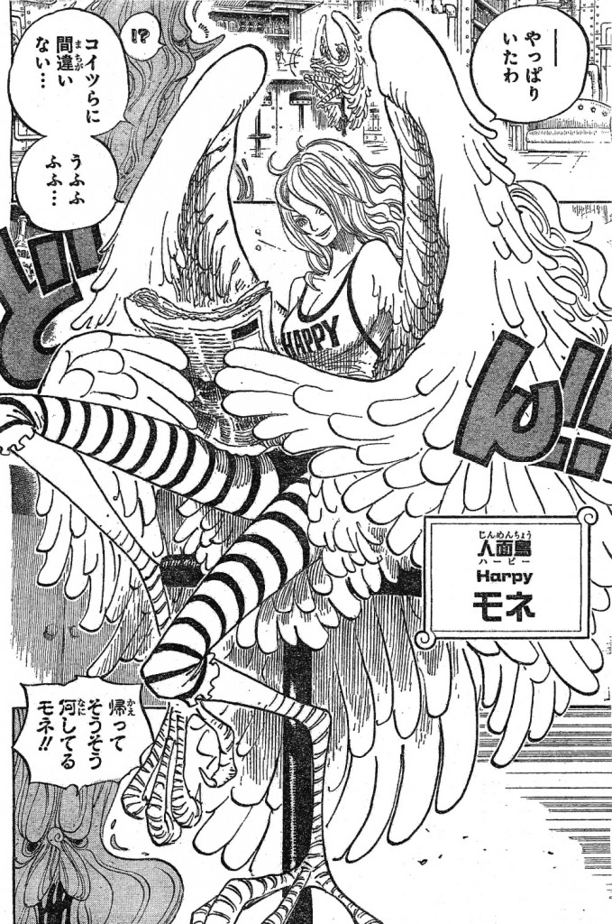 Se vi ricordate avevo insistito, molto l’anno scorso, sul ruolo di Caribo nella saga pretendente, la vera incognita della situazione. Caribo poi non ha avuto un ruolo così rilevante nella saga se non verso la fine (per poi continuare nelle attuali Mini Avventure). Ora però l’incognita di questa saga di Punk Hazard è Monet. Personaggio molto, molto ambiguo. Sembra provare simpatia per Law, lavora con efficienza e dedizione sotto Caesar ma è una spia di Joker. Non riusciamo nemmeno a capire se i suoi arti “da uccello” siano stati impiantati tramite i poteri di Law (così come tutti gli altri ibridi dell’isola) oppure se sia un suo Frutto Avis Avis (nello scorso capitolo Caesar parla di trasformazioni di Monet).