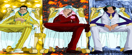 Molti sanno già, o almeno l’hanno sempre sospettato, che i soprannomi dei tre ammiragli non sono casuali… Akainu (cane rosso), Kizaru (scimmia gialla) e Aokiji (Fagiano Blu) sono i tre fiabeschi animali che, secondo quando racconta la famosissima leggenda giapponese, aiutarono l’eroe Momotaro a sconfiggere i suoi acerrimi nemici, gli Oni, conquistando il loro bottino e vivendo così una vita trascorsa nell’agiatezza e nella ricchezza, insieme ai suoi amici animali. Da questa leggenda, Eiichiro Oda sembra aver preso solo spunto per i nomi dei suoi ammiragli, che ha associato loro a seconda del colore del loro frutto rogia: magma rosso per Akainu, luce dorata per Kizaru e ghiaccio azzurro per Aokiji. Difatti, come affronterò in seguito, il carattere dei tre Ammiragli è quanto più diverso possibile da quello pacifico dei tre animali.