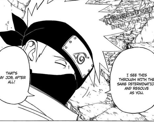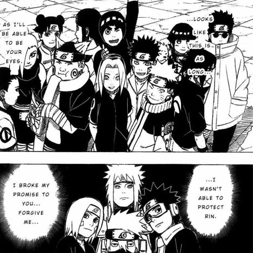 Kakashi, nonostante tutte le sue contraddizioni, è un personaggio che fonda il suo essere su un forte sentimento di responsabilità. Egli spesso decide di farsi carico di compiti molto gravosi ed il più delle volte nemmeno attrubuibili a lui: combattere e fermare Sasuke poichè è un suo allievo degenerato o diventare Hokage per salvaguardare la stabilità del villaggio. Lo abbiamo inoltre visto correre in soccorso di allievi in difficoltà o di un compagno nei guai: recentemente è arrivato su campo di battaglia ad aiutare Naruto contro Obito, o ancor prima durante la saga del quartetto del suono in cui decide, nonostante l’Hokage gli stia assegnando una missione di Rango S, di andare a cercare Naruto. Un altro episodio significativo in cui si assume grandi responsabilità (e rischi) non sue è il momento in cui decide di accompagnare e sorvegliare il Team 10 come sostituto di Asuma, appena morto in missione: anche questo esempio ci conferma come Kakashi sia un personaggio estremamente altruista e responsabile, accompagna il team di Shikamaru non tanto perchè desideroso di vendicarsi di chi ha ucciso un suo vecchio amico (sarebbe comunque più che comprensibile), quanto perchè sente delle responsabilità proprio verso il làscito di Asuma e riguardo a dei ragazzi che senza di lui sarebbero allo sbando. Responsabilità quindi, verso i propri compiti e nei riguardi dell’incolumità delle persone a lui care, ed è proprio questo secondo punto l’argomento di cui vorrei discutere maggiormente. Kakashi è attualmente il personaggio che meglio incarna lo spirito di gruppo (vedere la sua secolare amicizia con Gai) e l’amore per i suoi compagni, cos’ha spinto questo personaggio a diventare così integro e motivato? Ritengo che l’episodio a cui stiamo assistendo dall’ultimo capitolo possa essere stato il momento più importante per completare la sua trasformazione, ancor più che la morte di Obito: da servo delle regole e della riuscita delle missioni, a difensore della civiltà e del rispetto della vita (soprattutto quella dei suoi compagni). Sia che Kakashi sia artefice della morte di Rin in prima persona (e che quindi entrambi siano gli “originali” ed egli sia mosso da chissà quale proposito) sia che egli non l’abbia protetta (e che quindi o siano dei “falsi”, o sia un’illusione, comunque vada Rin morirà ed il ninja mascherato di Konoha non la salverà), Kakashi aveva la responsabilità di badare all’incolumità di Rin, era stata una promessa fatta al suo migliore amico morente, promessa che se pensiamo al mondo dei ninja narutiano (un mondo antico, fatto di valori come l’onore ed il rispetto) acquista un valore ancora più potente e solenne.