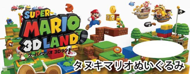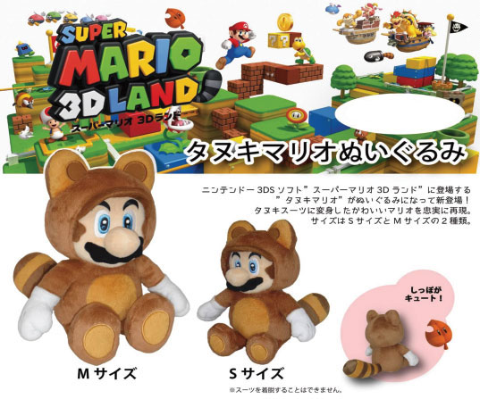 La compagnia di produzione San-ei Bōeki ha annunciato in questi giorni che per i primi di Aprile lancerà sul mercato un pupazzo di peluche rappresentante Super Mario in versione Tanuki (o Tanooki, com’è conosciuto nei paesi anglofoni). Il peluche rappresenterà Super Mario col suo costume da Tanuki così com’è stato presentato nel videogioco Super Mario 3D Land. La versione più piccola del peluche misurerà 4,5 x 4,5 x 9 pollici (equivalenti a circa 11 x 11 x 22 centimetri) e sarà venduta al prezzo di 1,400 yen (pari a circa 14€), mentre la versione media misurerà 6 x 6 x 12 pollici (equivalenti a circa 15 x 15 x 30 centimetri) e sarà venduta al prezzo di 2,600 yen (pari a circa 26€). Ancora non è stato annunciato se sarà fatta anche una versione grande o gigante dello stesso peluche.