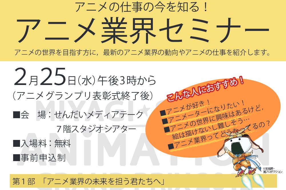 L’anime sarà presentato in anterprima mercoledì di questa settimana presso la biblioteca Sendai Mediatheque in occasione del Anime Gyōkai Seminar (Seminario sull’industria dell’animazione). Il fondatore dello Studio Pierrot, Yuji Nunokawa, parteciperà all’evento che si terrà tra le 15:00 e le 16:00. Nunokawa è originario di Sakata, nella prefettura di Yamagata, che è parte della regione del Tohoku che è stata colpita gravemente dal terremoto e dallo tsunami.