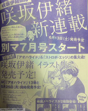 Venerdì della scorsa settimana, il numero di marzo della rivista di shojo manga Bessatsu Margaret edita dalla Shueisha ha annunciato che l’autrice di manga Io Sakisaka lancerà una nuova serie il cui primo capitolo sarà pubblicato sul numero di luglio della rivista stessa, in vendita il 13 giugno di quest’anno. La Shueisha pubblicherà anche una collezione di illustrazioni di Sakisaka il 25 maggio, nello stesso giorno in cui, in Giappone, uscirà il tredicesimo volume del suo manga A un passo da te (Ao Haru Ride). La collezione di illustrazioni presenterà pezzi creati sia per A un passo da te che per un altro manga della stessa autrice, Strobe Edge.