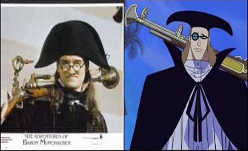 Il barone di Münchhausen è famoso per le sue gesta, come uscire vivo dalle sabbie mobili tirandosi lui stesso per il codino oppure viaggiare spedito sopra una palla di cannone, scena vista anche in One Piece. A compirla fu Kizaru, nella sua prima apparizione, mentre sbarcava a Sabaody.
