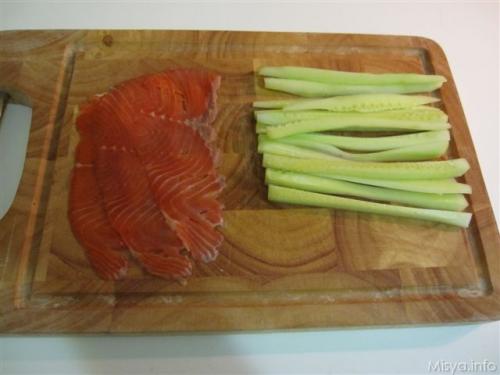 Piatto assai più complesso. Tagliate e disponete (come nell’immagine) il vostro pesce e un pezzo di cetriolio.