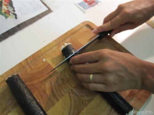 Tagliate a piccoli pezzi il rotolo. Mangiatelo accompagnato da una salsa che otterrete sciogliendo il wasabi con la salsa di soia.