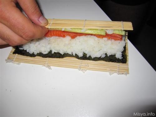 Adagiate su una stuoia di bambù (va bene anche della carta da cucina…XD) la vostra Nori. Aggiungetevi mezzo centimetro di riso. Chiudete la stuoia, compattando per bene il tutto.