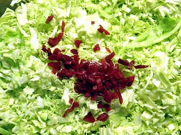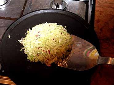 – Fate scaldare la piastra, ed aggiungete il cavolo e l’impasto