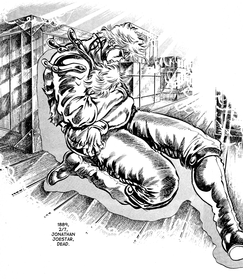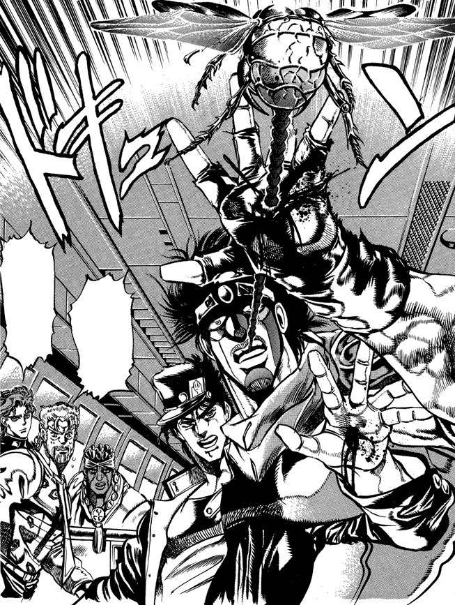 Jojo è un manga di combattimenti! A volte possono essere soltanto delle prove di abilità… che possono comunque degenerare in sanguinolente lotte, ma è indubbio che i personaggi combattono molto. Ad essere precisi, combattono e viaggiano molto, al punto tale che i momenti di pausa nella serie sono pressochè inesistenti. Ci sarà tempo e modo di parlare di Onde Concentriche e di Stand in maniera approfondita, quello che mi preme di sottolineare è che a parte brevi spezzoni nelle prime due serie, Jojo non è un manga che basa la crescita delle capacità belliche dei personaggi attraverso l’allenamento (come fa invece lo shonen moderno) ma con l’esperienza diretta sul campo di battaglia. Si può tranquillamente affermare che la maggior parte dei personaggi non diventerà mai più potente rispetto a quanto lo era nel momento della sua apparizione, ma acquisirà quel plus valore chiamato esperienza: chiamo in causa ancora Jotaro, che da prova di questa esperienza nella quarta serie mostrando che spesso è proprio questa insieme all’intuito a permettere la sopravvivenza nel terrificante mondo dei portatori Stand. Jojo è uno dei manga che per la natura dei suoi combattimenti, uso definire “uno tra quelli con la maggiore densità di cose che possono uccidere per pagina”: nonostante i loro grandi poteri, basta spesso un singolo colpo ben assestato perchè un personaggio venga sconfitto, e tanti sono quelli che hanno fatto una brutta fine nel corso degli anni (non siamo comunque di fronte a un’ecatombe come Hokuto no Ken). Altra questione da tenere presente è quella dei power-up: essi sono presenti, almeno uno a serie, e spesso sono eventi centrali nella storia; trall’altro, i più consistenti sono spesso proprio quelli del cattivo principale. Come questi avvengono è legato sempre alla complessa visione di Araki, ed è una di quelle cose che analizzerò quasi caso per caso (poichè in fondo non sono tantissimi).
