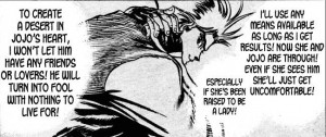 Jonathan Joestar, il primo Jojo, si differenzia da tutti i suoi discendenti per una crescita e una maturazione completa nel corso della serie, non solo dal punto di vista del controllo delle Onde Concentriche, ma anche riguardo ai suoi valori e obiettivi. Il primo Jojo vuole essere un gentil’uomo ed essere d’aiuto a tutte le persone che possono aver bisogno di lui e nonostante la sua debolezza mostra un ammirevole spirito di sacrificio, ma si tratta poco più di un bambino che sventola una bandiera troppo pesante per lui. Crescendo rimane la stessa persona dedita ad ideali di giustizia, ma il suo sguardo è diretto alle persone intorno a lui, principalmente il padre ed Erina ma anche lo stesso Dio, poichè Jonathan è consapevole di essere in parte responsabile per la follia consumata nella sua abitazione. Se doveste interrogarmi su quale sia la caratteristica specifica di Jonathan in quanto Joestar (come ben sapete ognuno di essi ha le sue peculiarità) credo sceglierei “l’umanità”: Jonathan si dispera ma non si lascia vincere dai sentimenti negativi contrastando i suoi nemici con il solo coraggio, che come ben sapete è la vocazione propria dell’eroe, ama e odia, prova rabbia e tristezza… quanti di voi si sono accorti che questi sei punti corrispondono anche alle emozioni di base che bisogna conoscere per padroneggiare la Muso Tensei dell’Hokuto Shinken? Adoro Phantom Blood e questo personaggio, forse infantile, forse sciocco, ma dedito ai suoi ideali fino alla fine: penso che nella letteratura di ogni genere abbiano più impatto i grandi eroi che si distinguono per dei piccoli gesti, forse perchè solo attraverso essi è possibile vedere la grandiosità (vi esorto a ripensare a qualche poema epico o romanzo fantasy e ai loro momenti più commoventi, personalmente i primi che mi vengono in mente sono la discussione tra Achille e Priamo al termine dell’Illiade, o le azioni di Samvise Gamgee dal momento in cui la Compagnia si scioglie a quando si carica Frodo sulle spalle alle soglie del Monte Fato…).